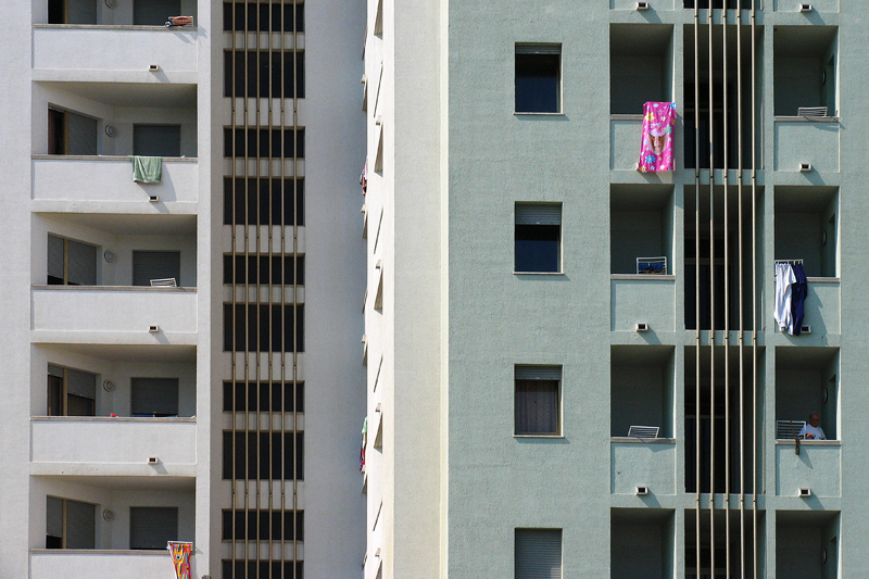 che punteggiano gli esterni di questi edifici, se non altrettante "finestre"sulla vita che scorre, come una linfa, all’interno dei palazzoni, pensati